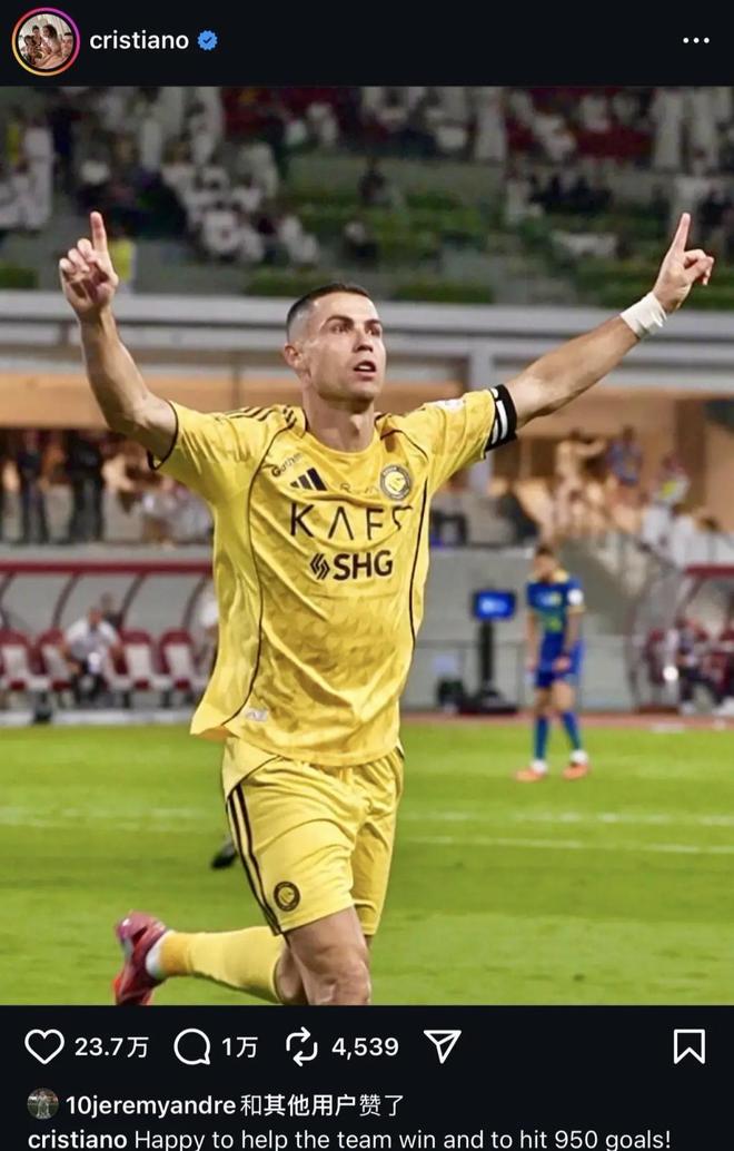 赛后C罗通过社交媒体表示:“很高兴能够帮助球队赢球,并且打进第950球!永远渴望更多。”