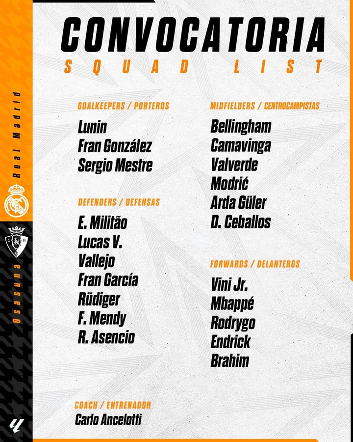 11月8日讯 11月9日21点,本轮西甲,皇马将在主场对阵奥萨苏纳。皇马公布本场比赛名单,姆巴佩、贝林厄姆、维尼修斯等人均进入比赛名单。